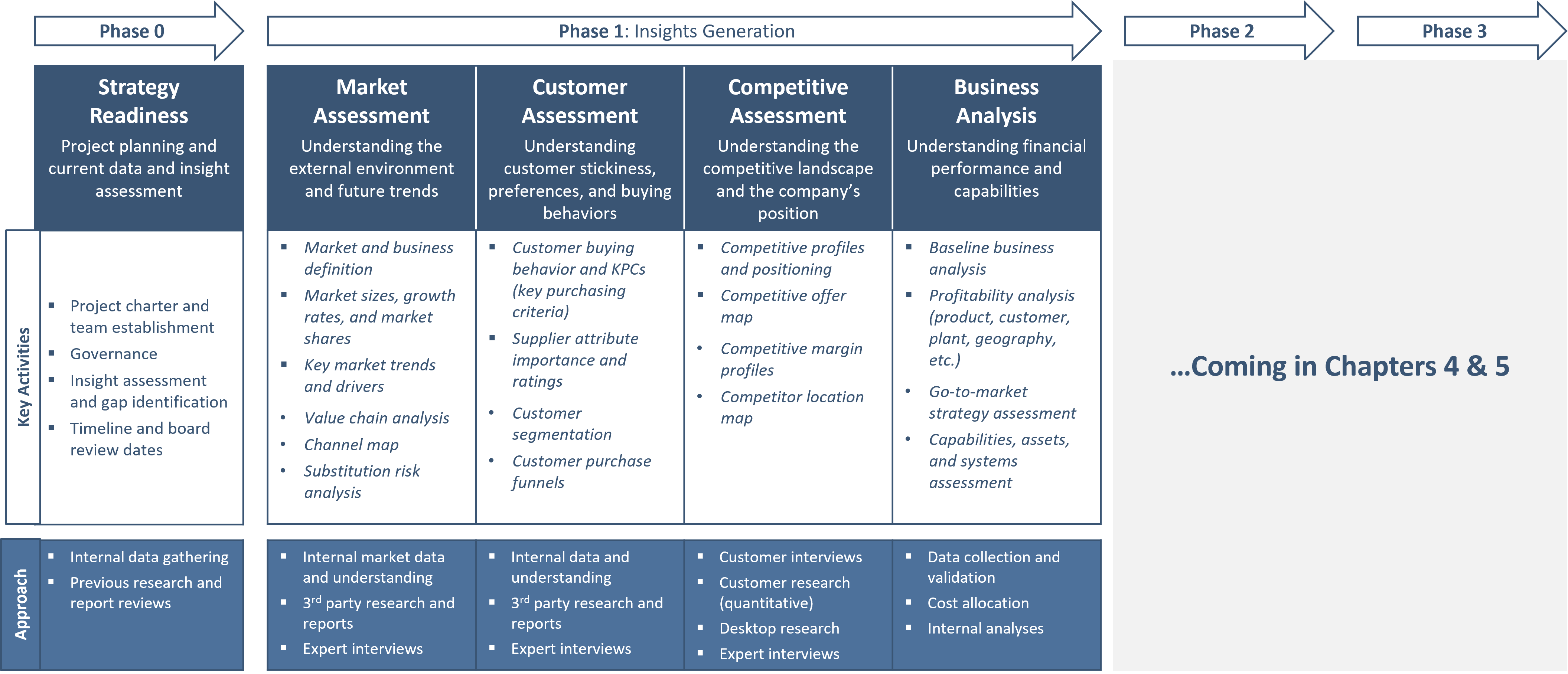 We typically split the insights generation phase into four simultaneous workstreams completed over 2 – 4 months: market assessment, customer assessment, competitive assessment, and business performance analysis (as discussed in our last chapter, timeline will be largely dependent on the quality of existing insights). Each workstream may be managed by separate project teams and leverage different subject matter experts within the organization, but these workstreams need to ultimately come together as one cohesive narrative for the business. And while unique workstreams can produce insights individually, it is the synthesis of the four workstreams that most often yields true insight.
