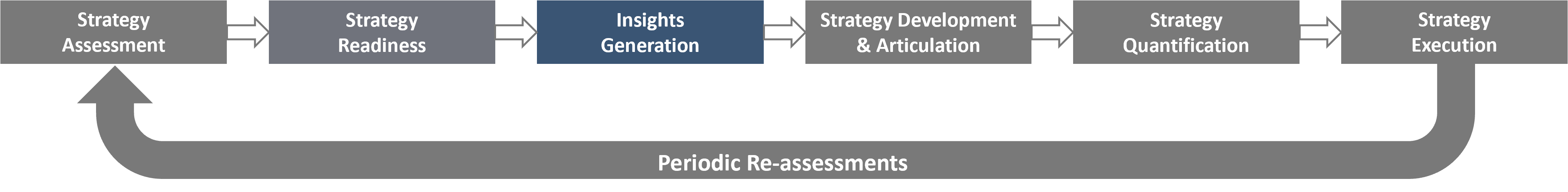 We strongly believe the core of any sound strategy is deep, proprietary insight uncovered through thorough research and analysis. True insights go beyond facts, figures, and observations; they are data-backed “a-ha” discoveries that (re-)define how you view your business landscape, and often arrived at through the careful analysis and synthesis of various findings. Their proprietary nature provides a competitive advantage while establishing a “single source of truth” across the organization, and it is these insights that serve as the foundation from which to make strategic choices. Generating insights for your business often presents an opportunity to challenge internal narratives, so expect to tackle difficult questions with significant implications for your business and team.