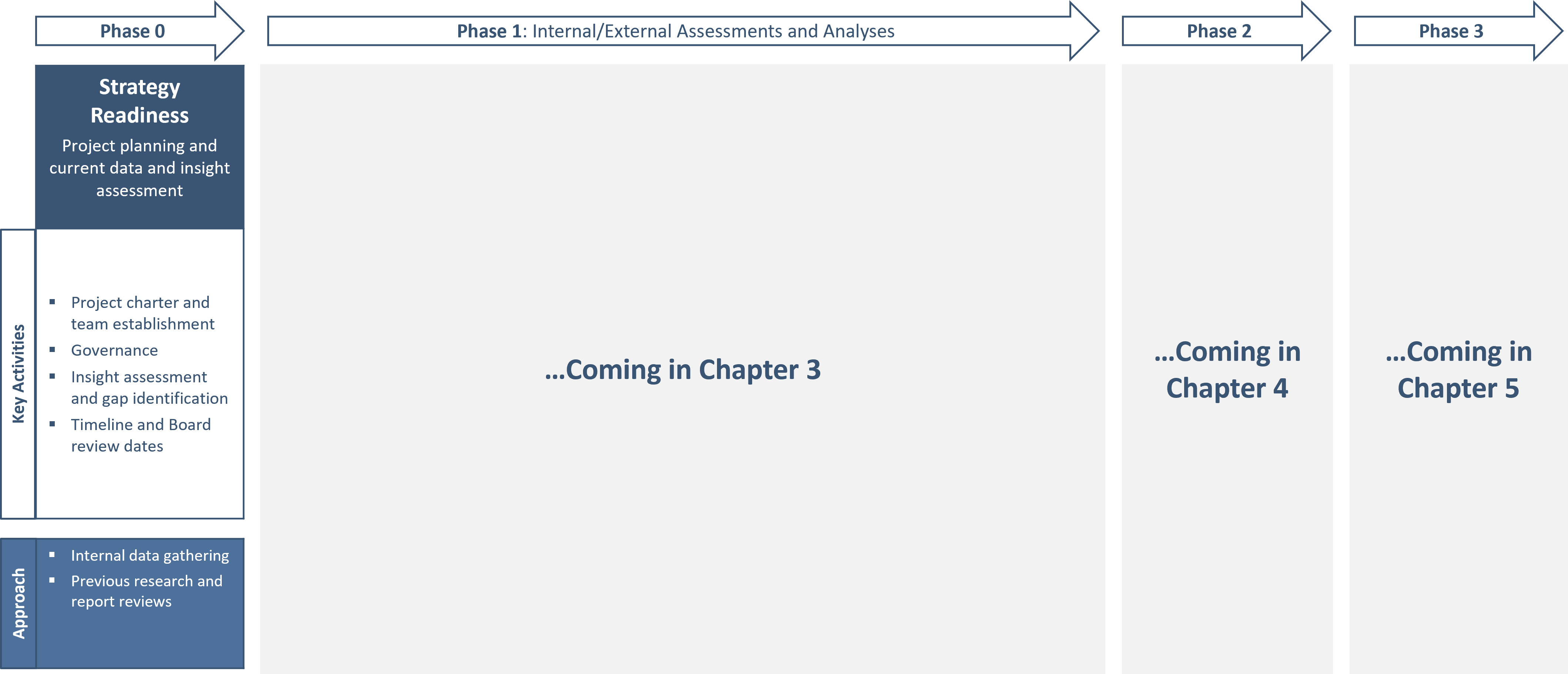 This chapter and our following two chapters cover the entire 6-8-month end-to-end strategy development process. The remainder of this chapter focuses on the “Strategy Readiness” phase, which typically comprises the first 2-4 weeks.